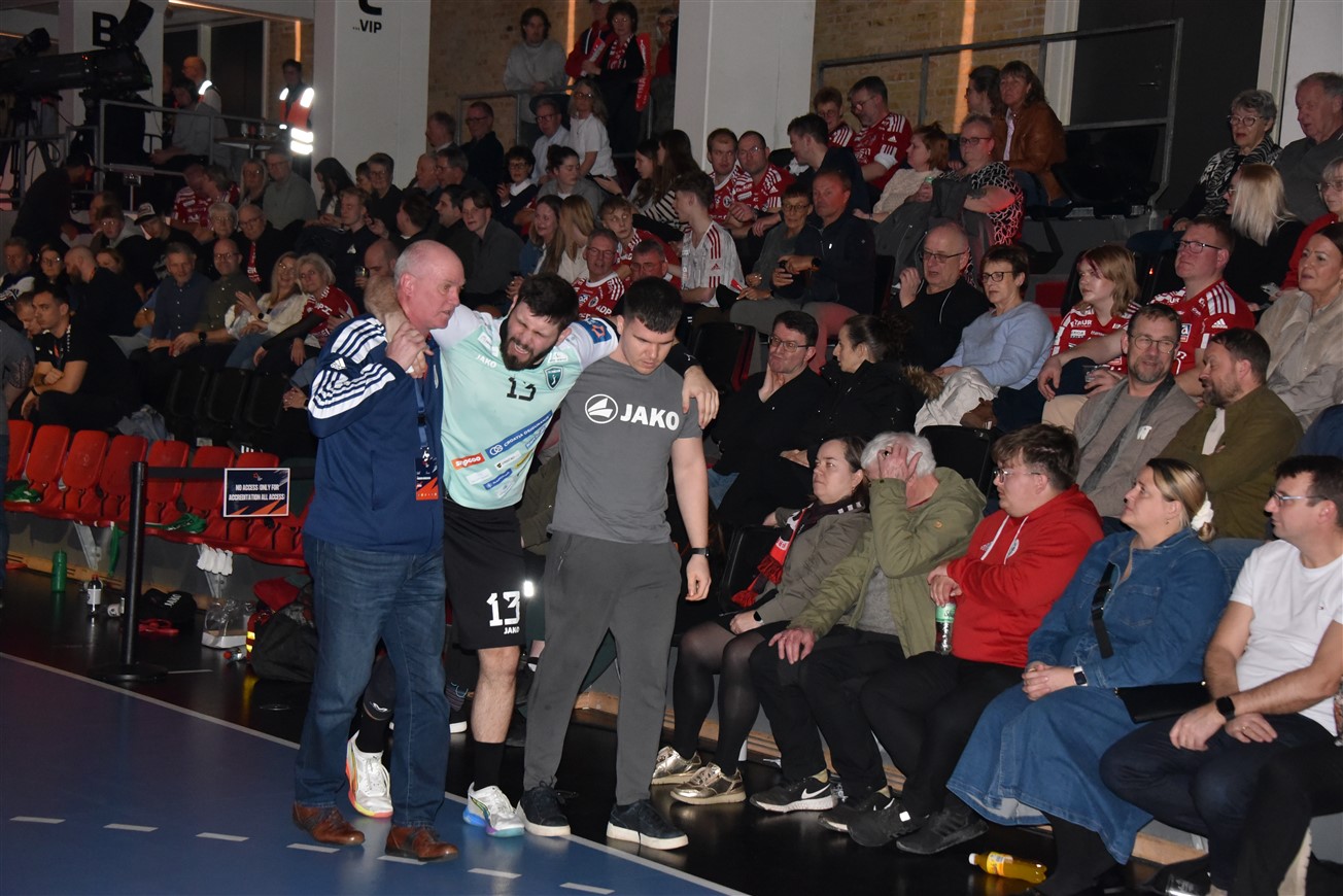 Odlično smo ušli u utakmicu dvama pogocima Matka Moslavca koji je večeras bio nezaustavljiv. Danci su poveli s 1:0 i to je bila njihova jedina prednost u večerašnjoj utakmici. Preuzeli smo vodstvo u 3. minuti i do kraja utakmice samo povećavali prednost. U samo nekoliko minuta radimo mini seriju 4:1 i odvajamo se na tri pogotka prednosti. Nakon toga je uslijedila mini serija domaće ekipa koja se uspjela približiti na samo pogodak zaostatka. U 13. minuti bilo je 9:10, a upravo se ta minuta pokazala kobnom za dvojicu naših igrača. Petar Krupić u našem je napadu pri nagloj promjeni smjera osjetio bol u leđnim mišićima, a nakon sudara s Pevnovim u obrani ozljeda je eskalirala i morao je uz bolnu grimasu napustiti teren. Nakon intervencije naše liječničke službe, Krupa je vrlo brzo prebačen u svlačionicu i za njega je utakmica bila gotova. U našem idućem napadu kompletna je ekipa protrnula kada je Matko Moslavac nezgodno stao i završio na tlu. Ponovno su intervenirali naši fizioterapeuti i pomogli Matku da izađe s terena. Na sreću, bol je bila samo trenutna i Matko se vrlo brzo vratio u igru. Do kraja utakmice maestralno je odigrao postigavši ukupno osam pogodaka. Isto toliko dodao je i Ivan Barbić pogodivši čak osam sedmeraca, a jedan je udarac na žalost zaustavila greda.